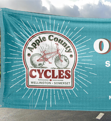 The store is close to the famous Sheppy’s Cider and surrounded by cider apple orchards, hence the name. A specific request was made for the design to include a BMX with apples for wheels and the design should resemble a cider bottle label...